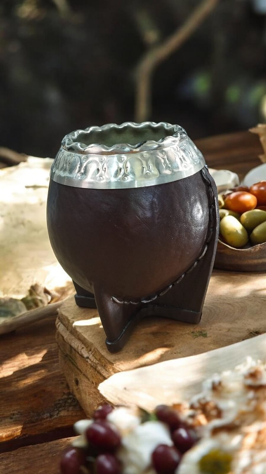 Las patas reforzadas le dan firmeza sobre cualquier superficie, convirtiéndolo en un compañero confiable tanto en la mesa de la cocina como en una ronda al aire libre. El cuero vaqueta que lo envuelve transmite calidez y tradición, y cada pieza artesanal refleja el cuidado de quienes lo fabrican.